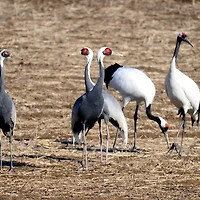 그런데, 흑두루미가 갈대밭에서 몇 마리씩 날아서 벌판으로 나왔다.