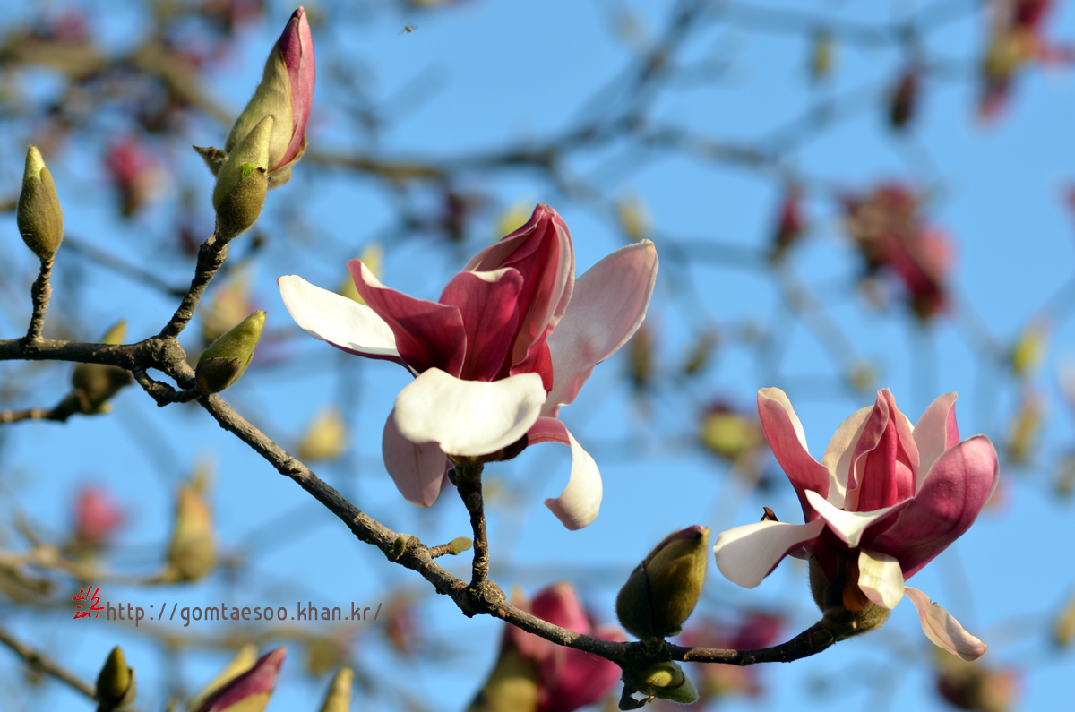 우리가 흔히 보는 목련, 자주빛 목련은 중국 원산 백목련, 자주목련이다.