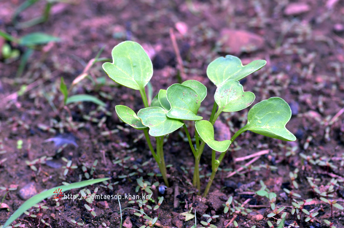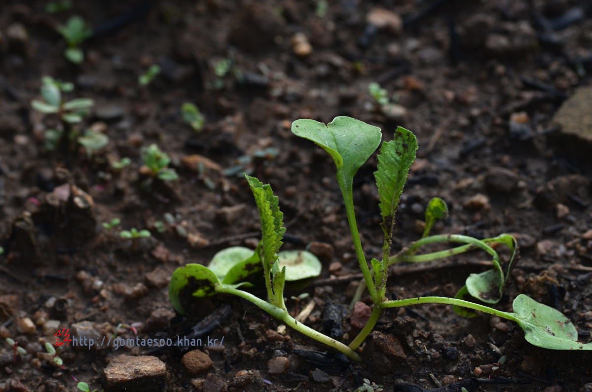 뿌린 무씨가 곧게 싹이 트고 둥근 떡잎을 냈다.