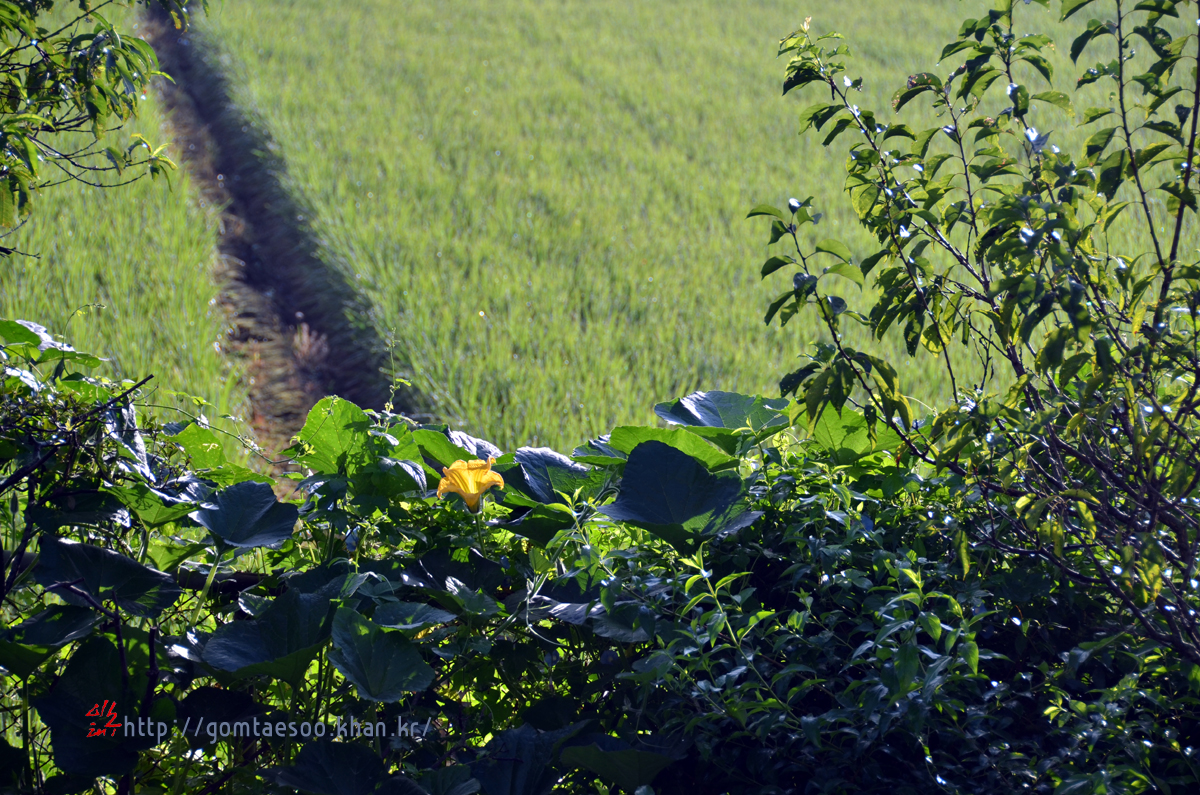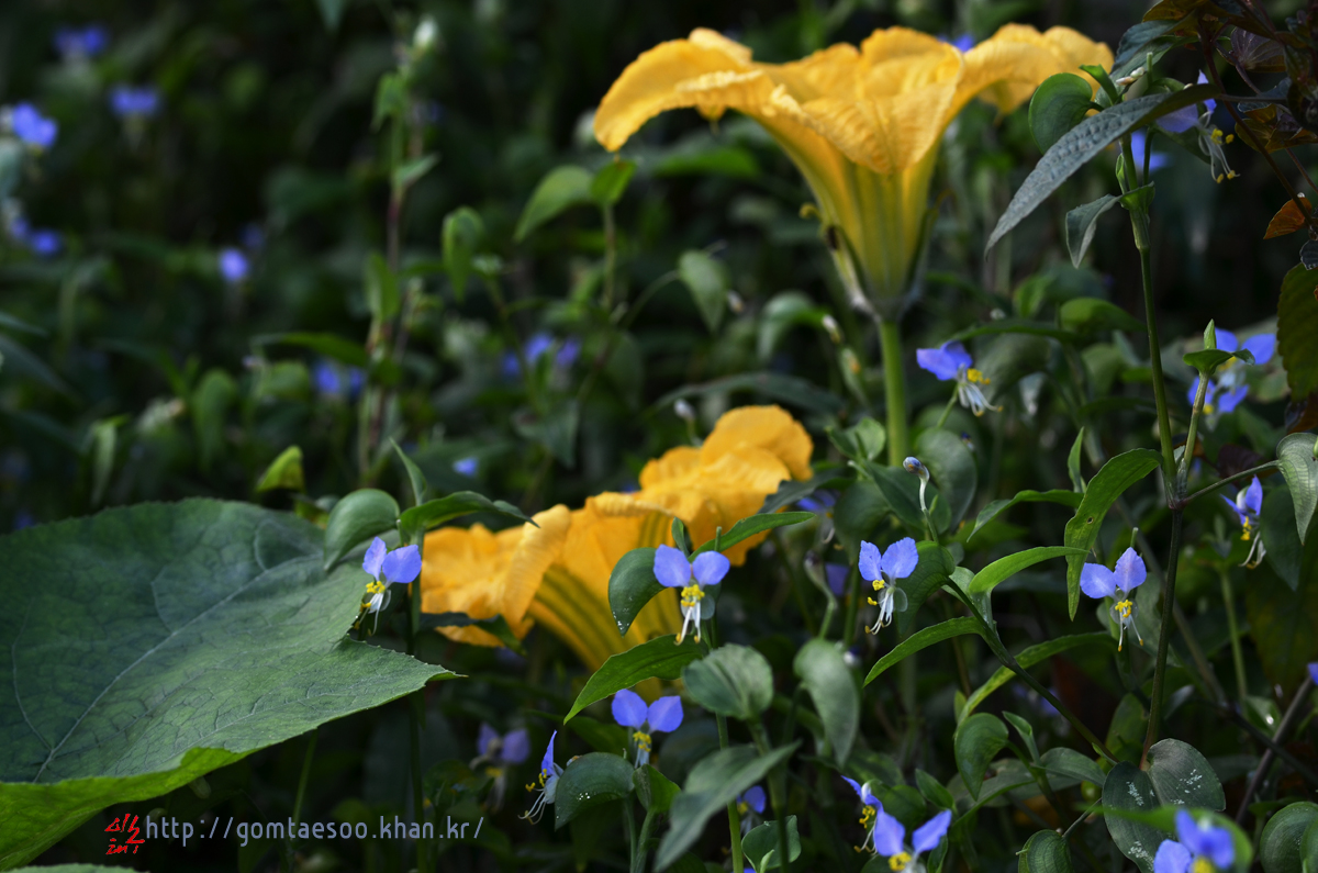 호박꽃과 달개비 꽃이 어울려 춤추듯 피었다.