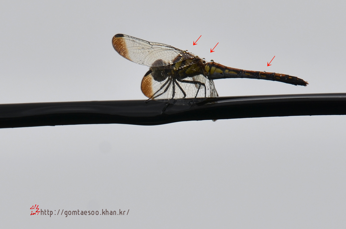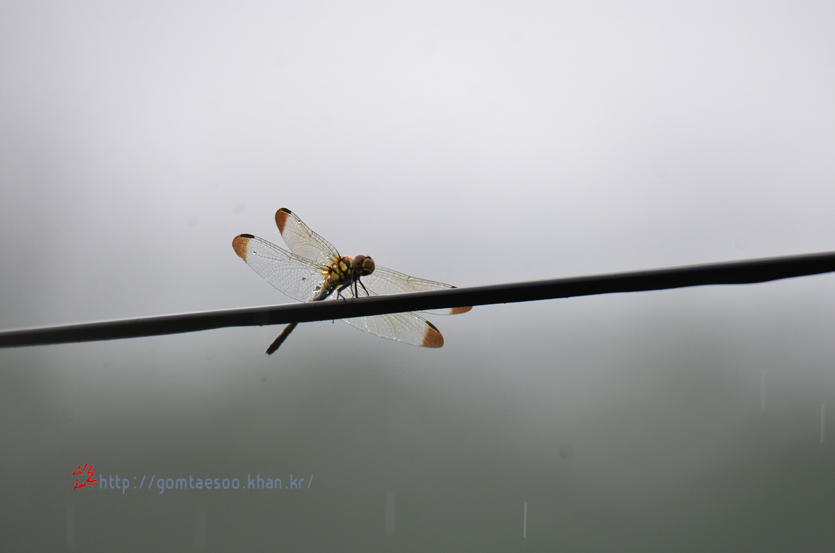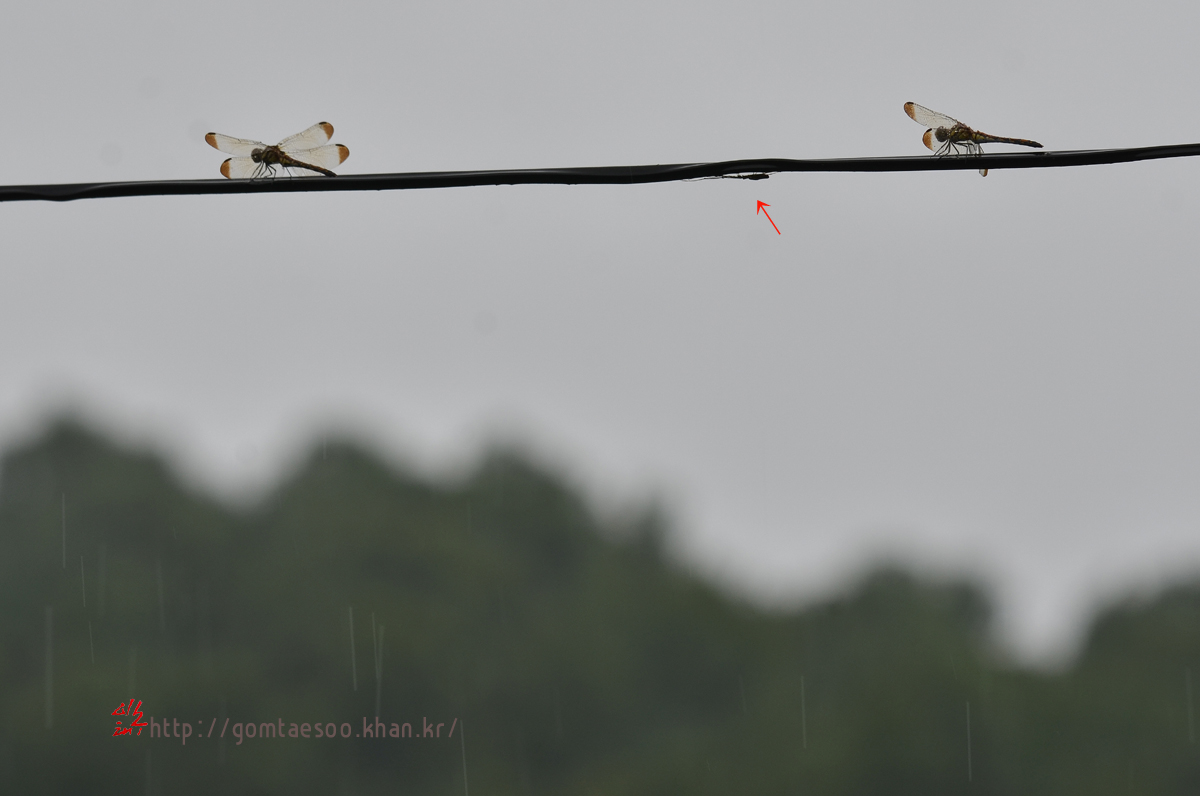 깃동잠자리 대여섯 마리가 전깃줄에 앉아 비를 맞는다.