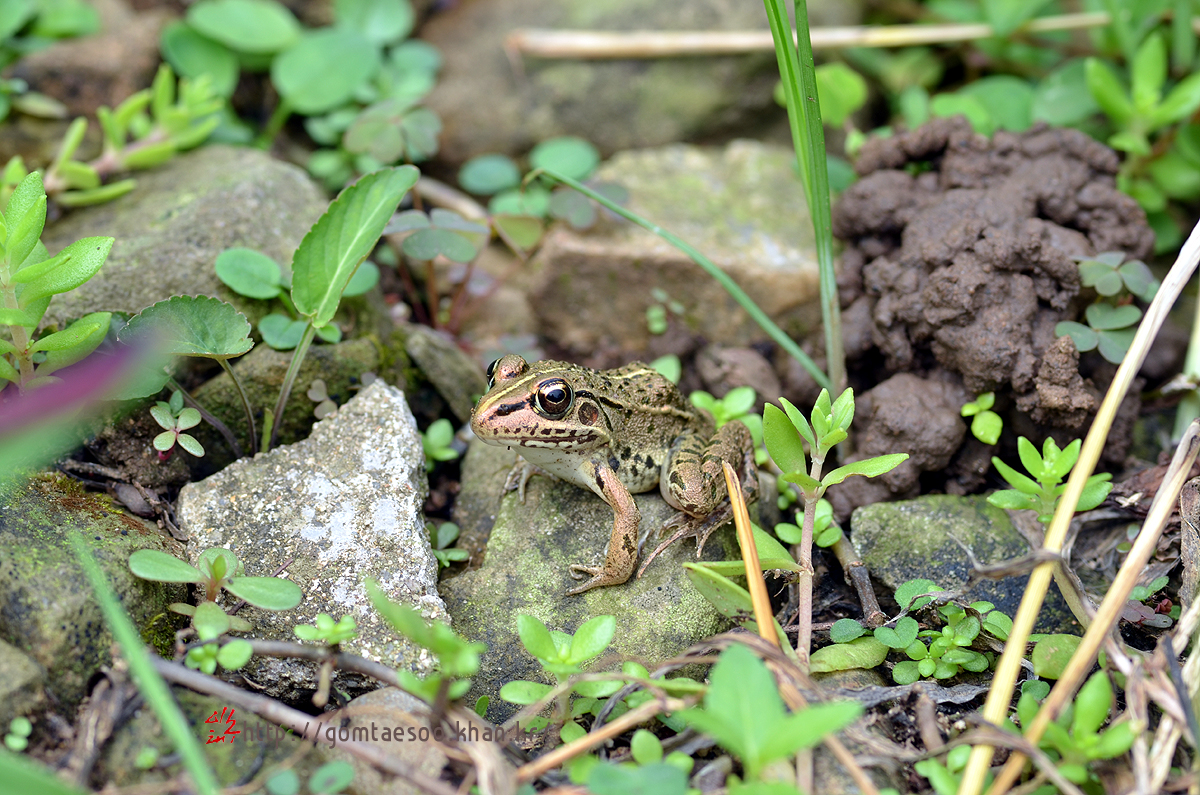 어린 참개구리가 마당을 이리저리 둘러본다.