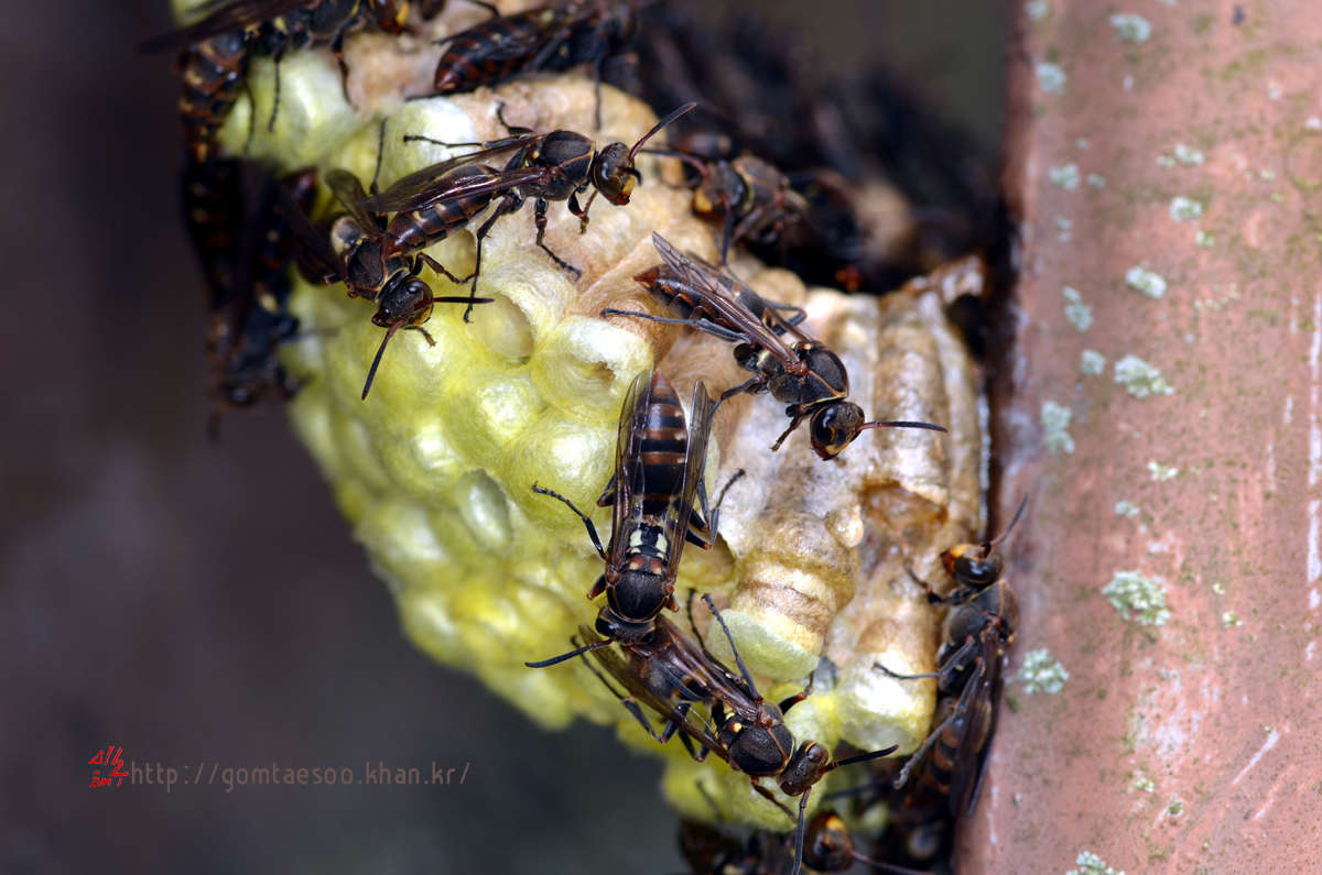 철 계단 밑에서, 처마 밑에서 어리별쌍살벌은 후손이 태어나기를 기다리고