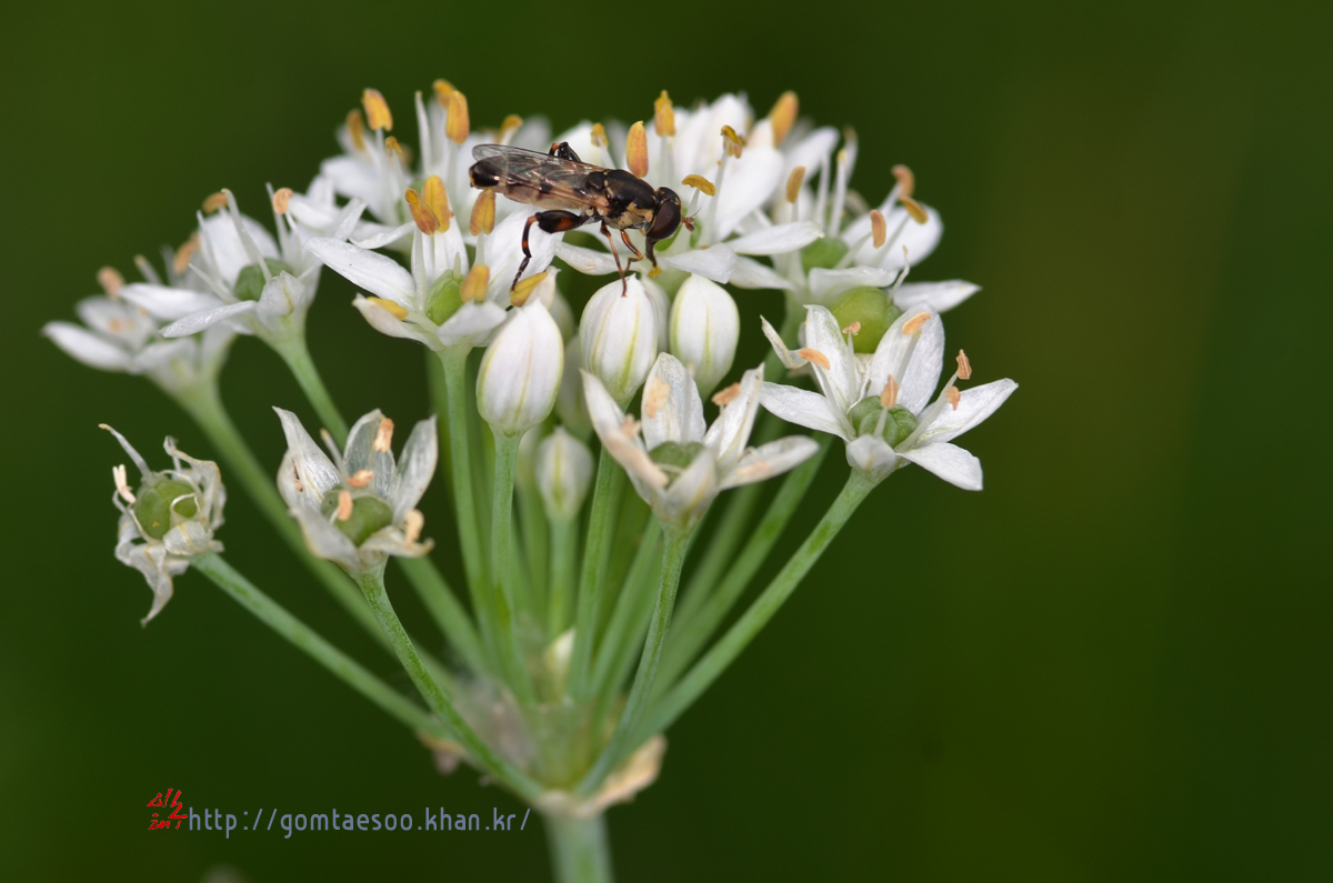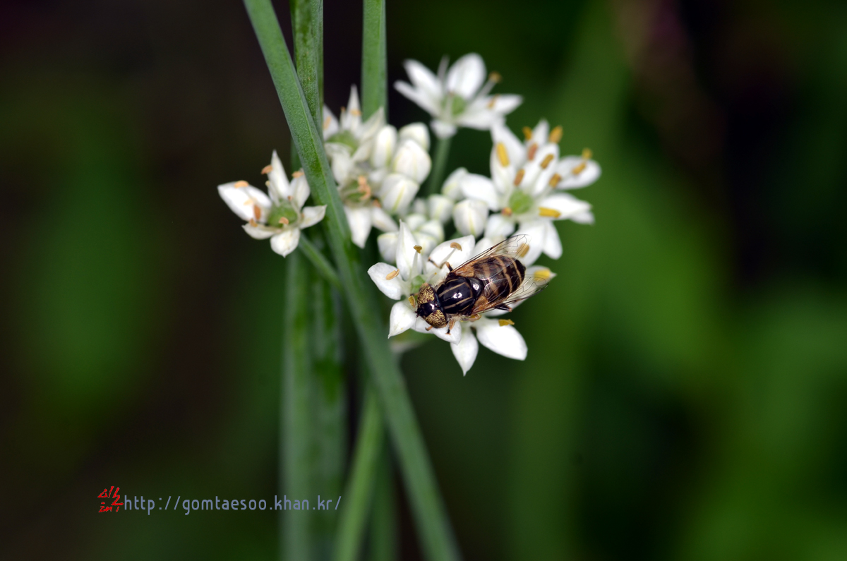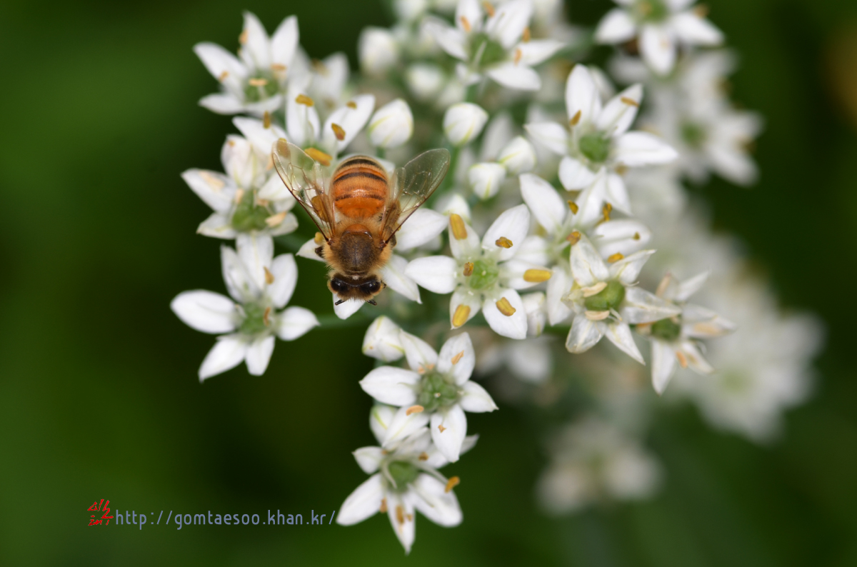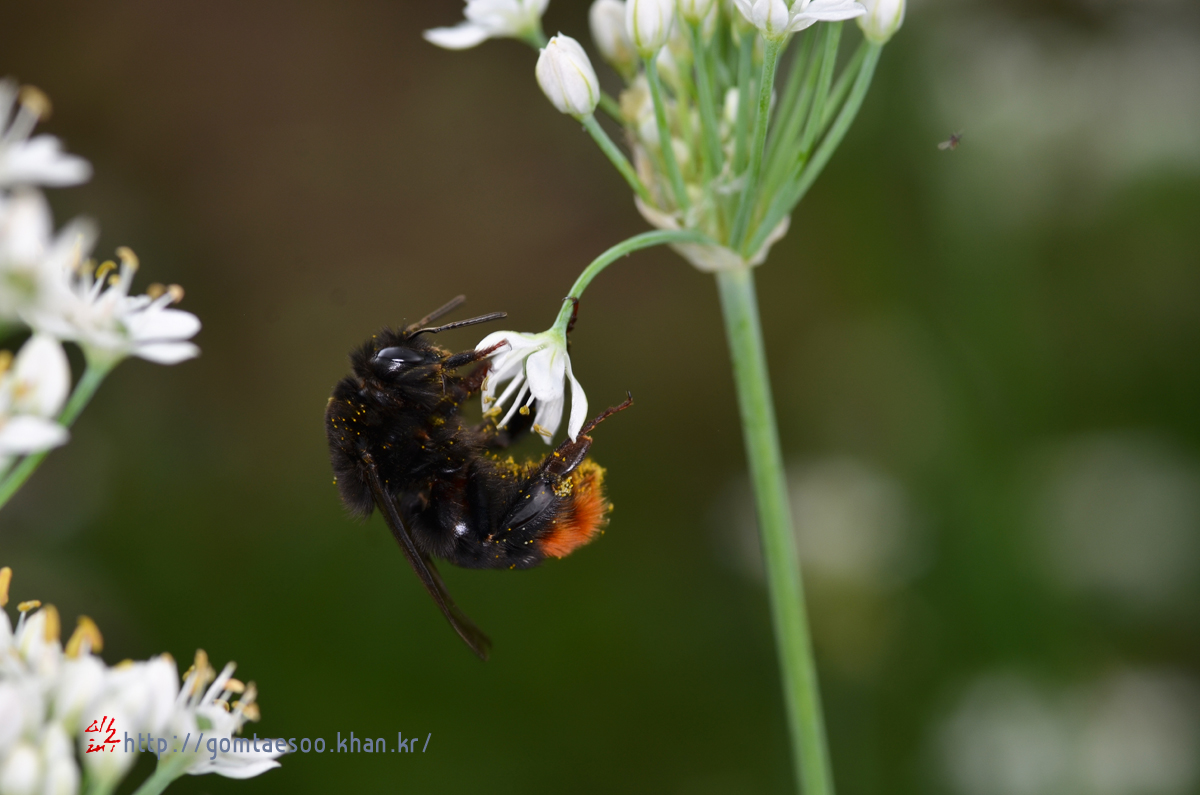 붕붕 덩치 큰 순둥이 호박벌이 부추 꽃 꿀을 빤다.