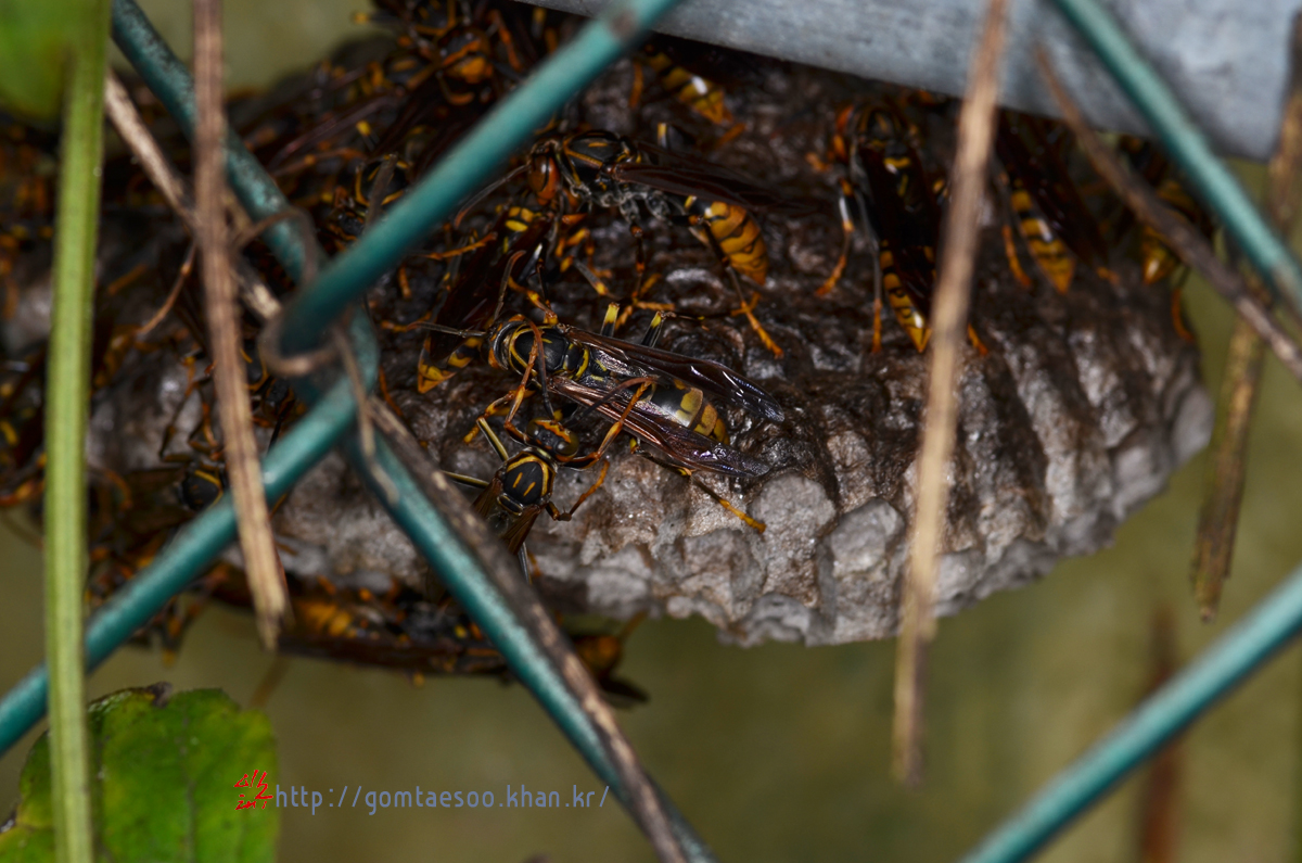 철망 울타리에 집을 지은 쌍살벌 왕바다리는 북적이고