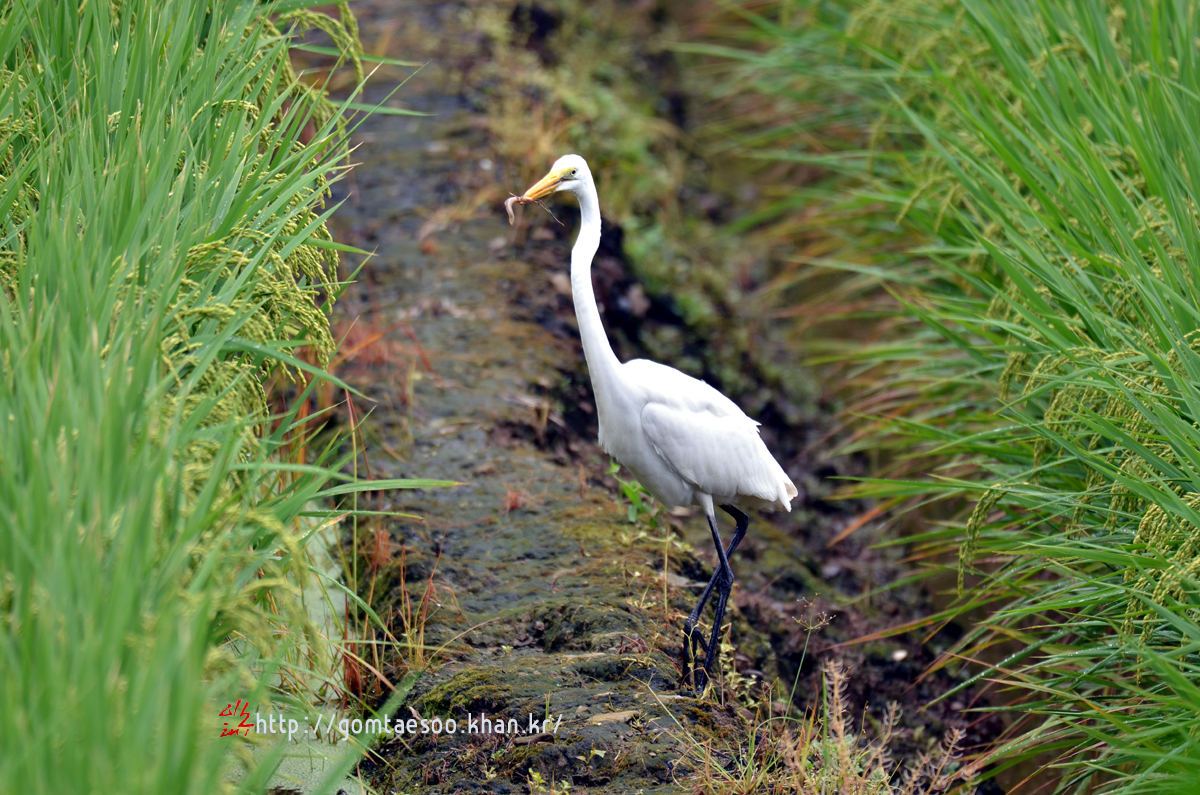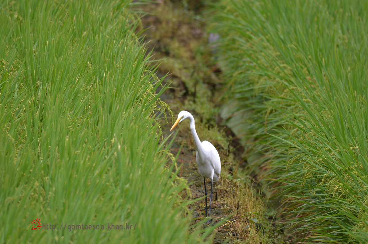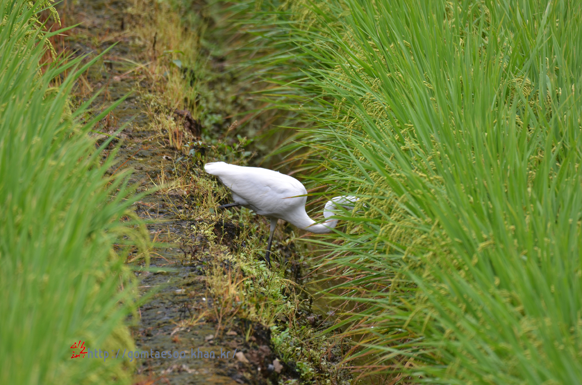비바람이 멎은 사이 어린 중대백로가 논둑을 걷는다.