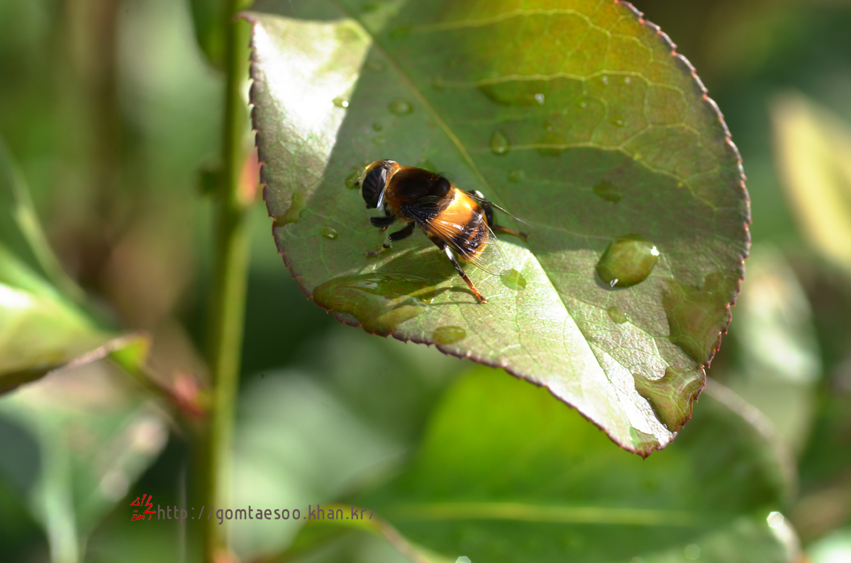 왕꽃등에는 부추 꽃 꿀을 빨다 명자나무 이파리에서 쉰다.
