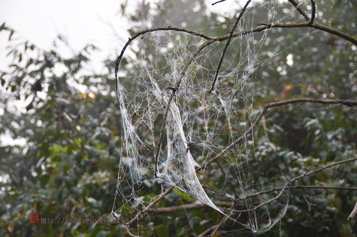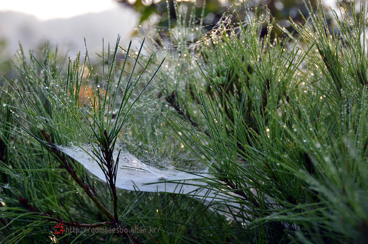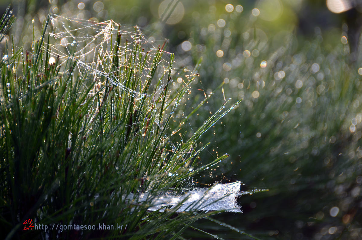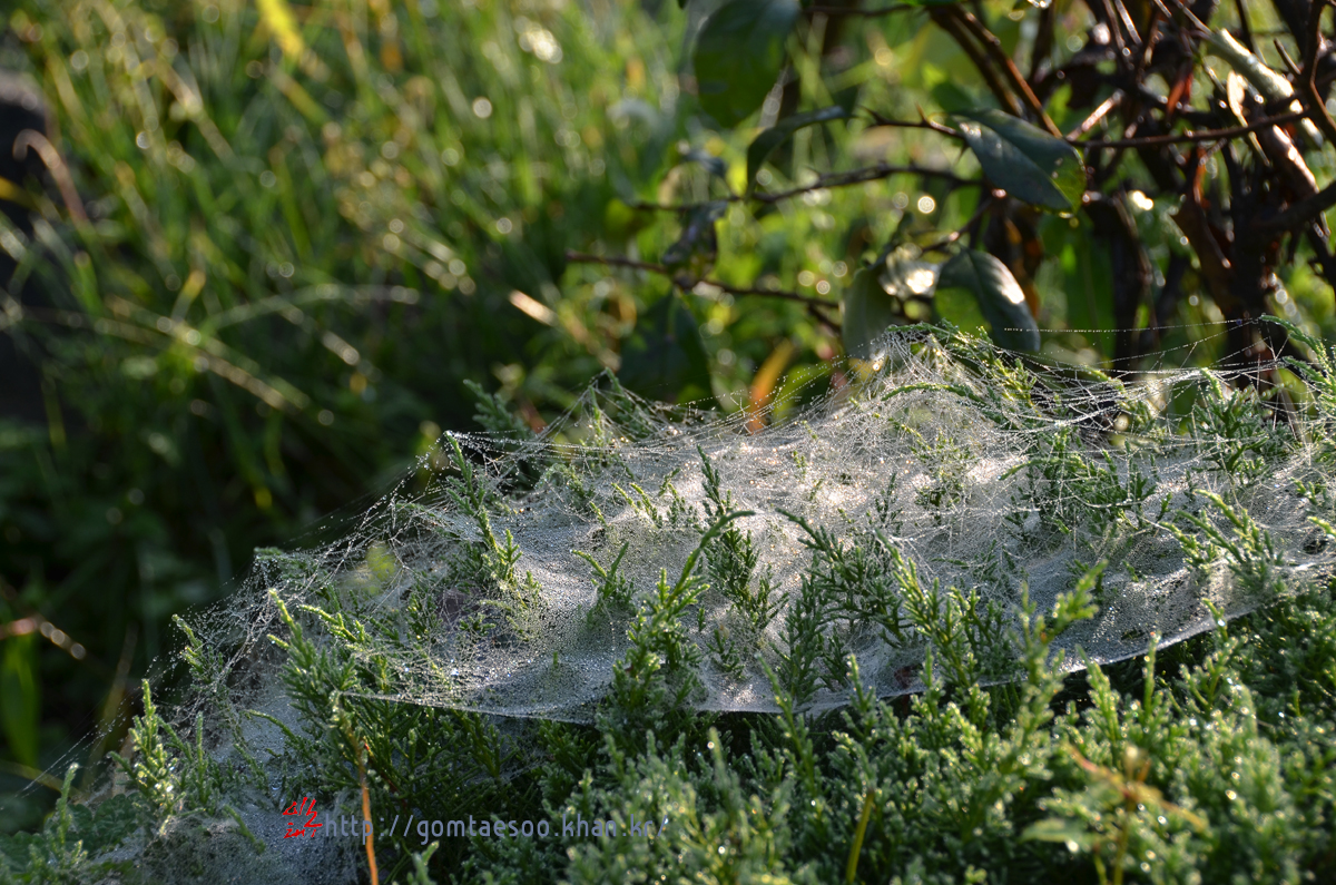 이슬 맺힌 거미그물이 아침 해를 받아 아름답기만 하다.