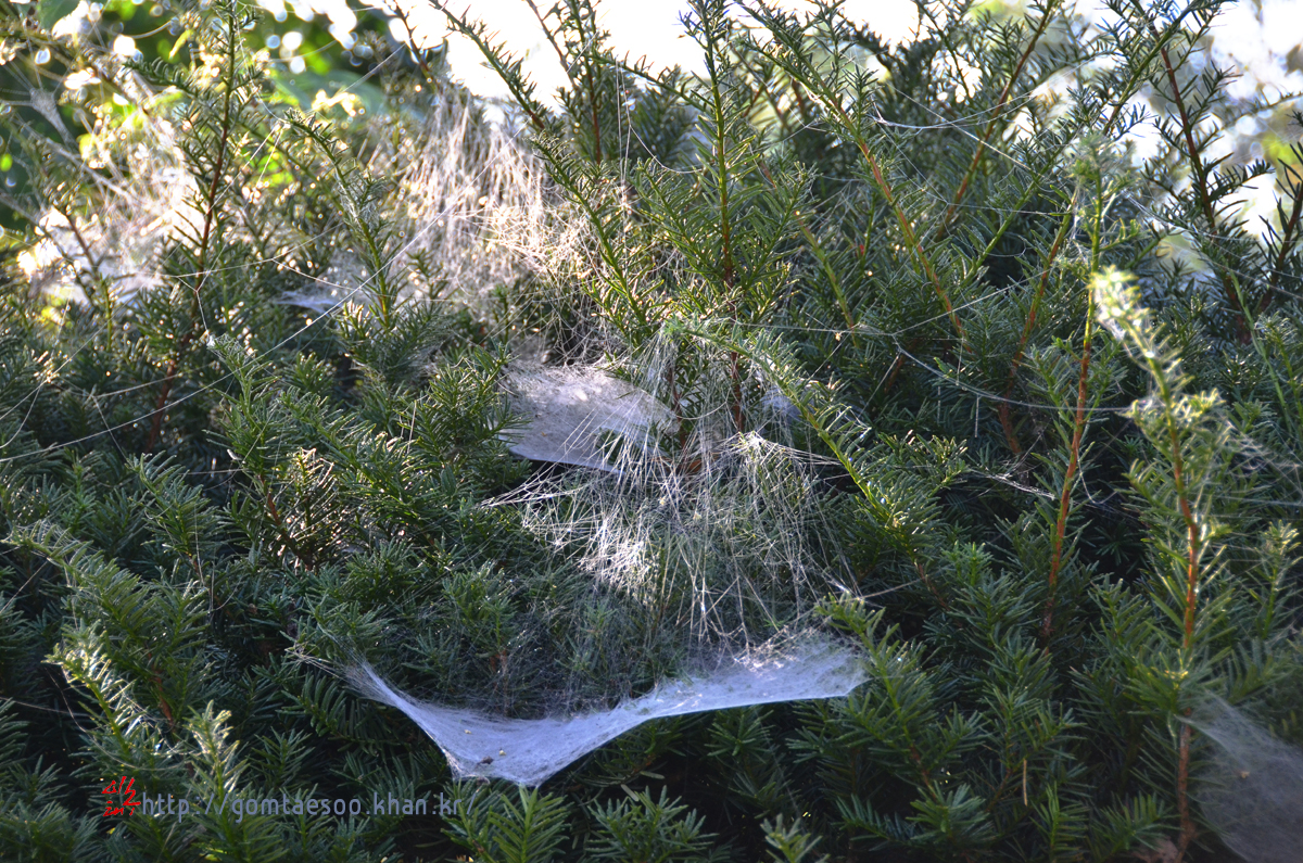 올해는 마당에 있는 작은 나무를 뒤덮은 거미그물이 많다.