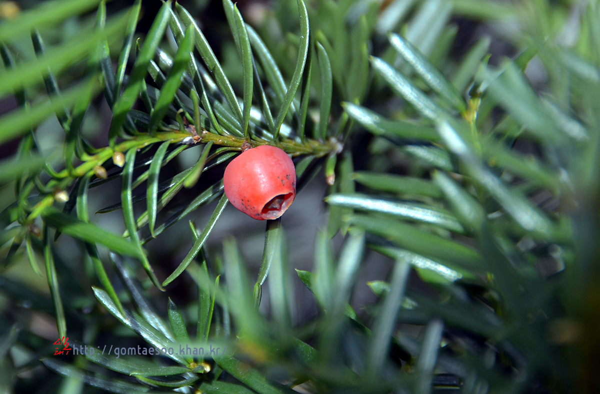 검푸른 이파리에 숨어서 붉게 익는 주목 열매.