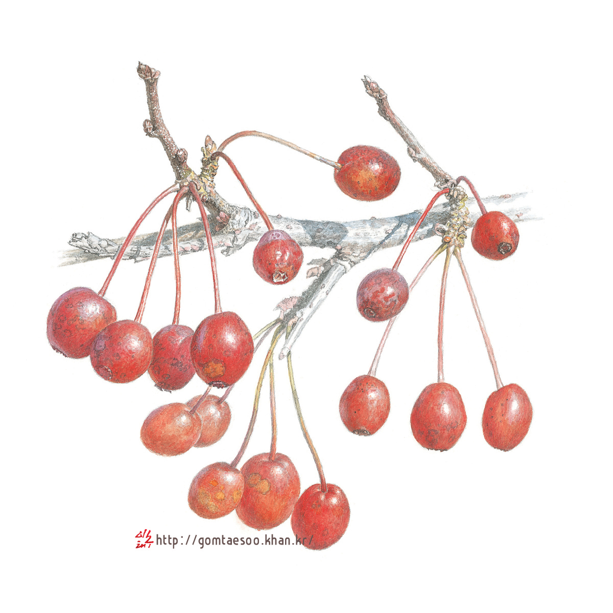 사과나무 뿌리가 되는 검붉은 아그배나무 열매.