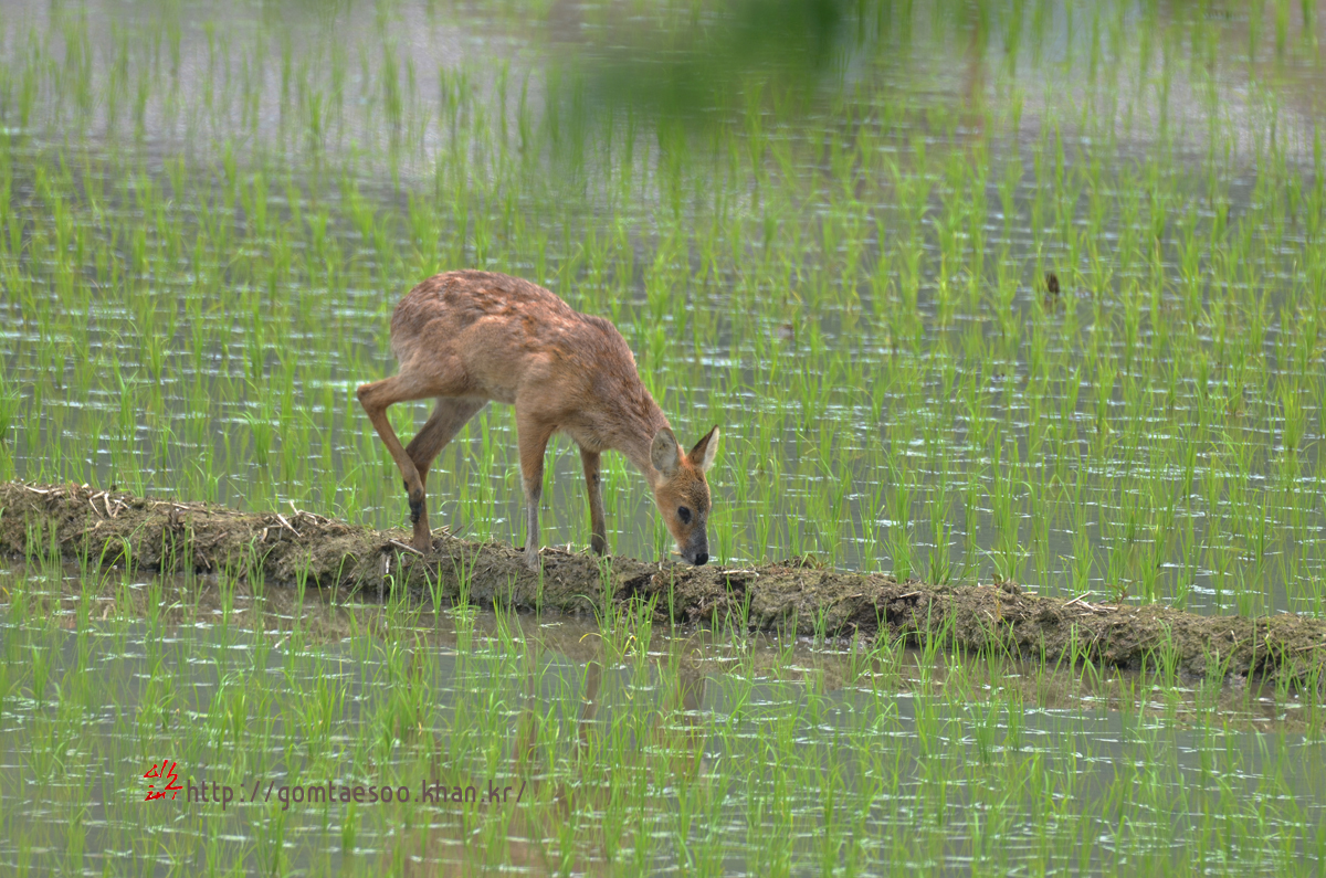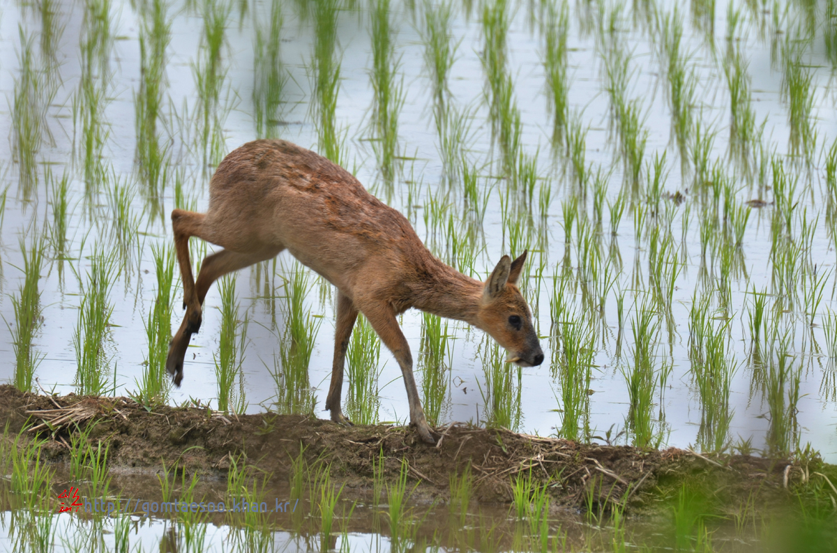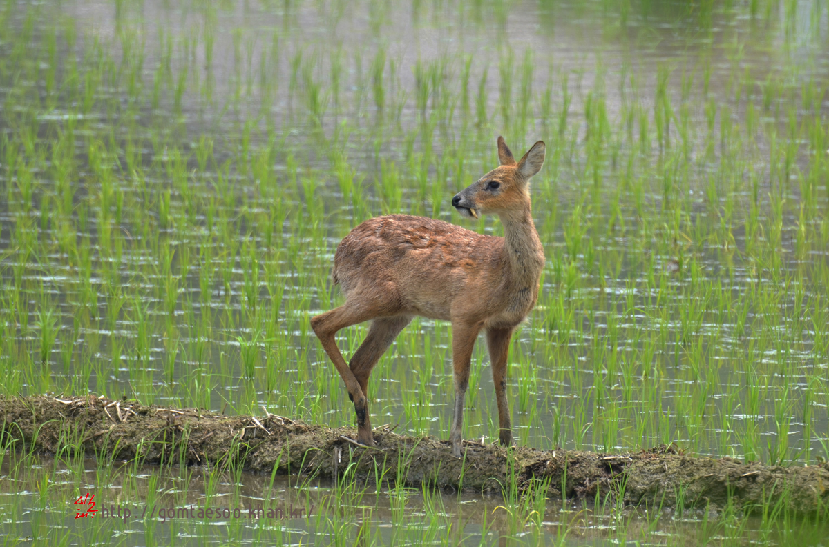 논둑에 훤칠한 고라니가, 멋진 고라니가 왔다.